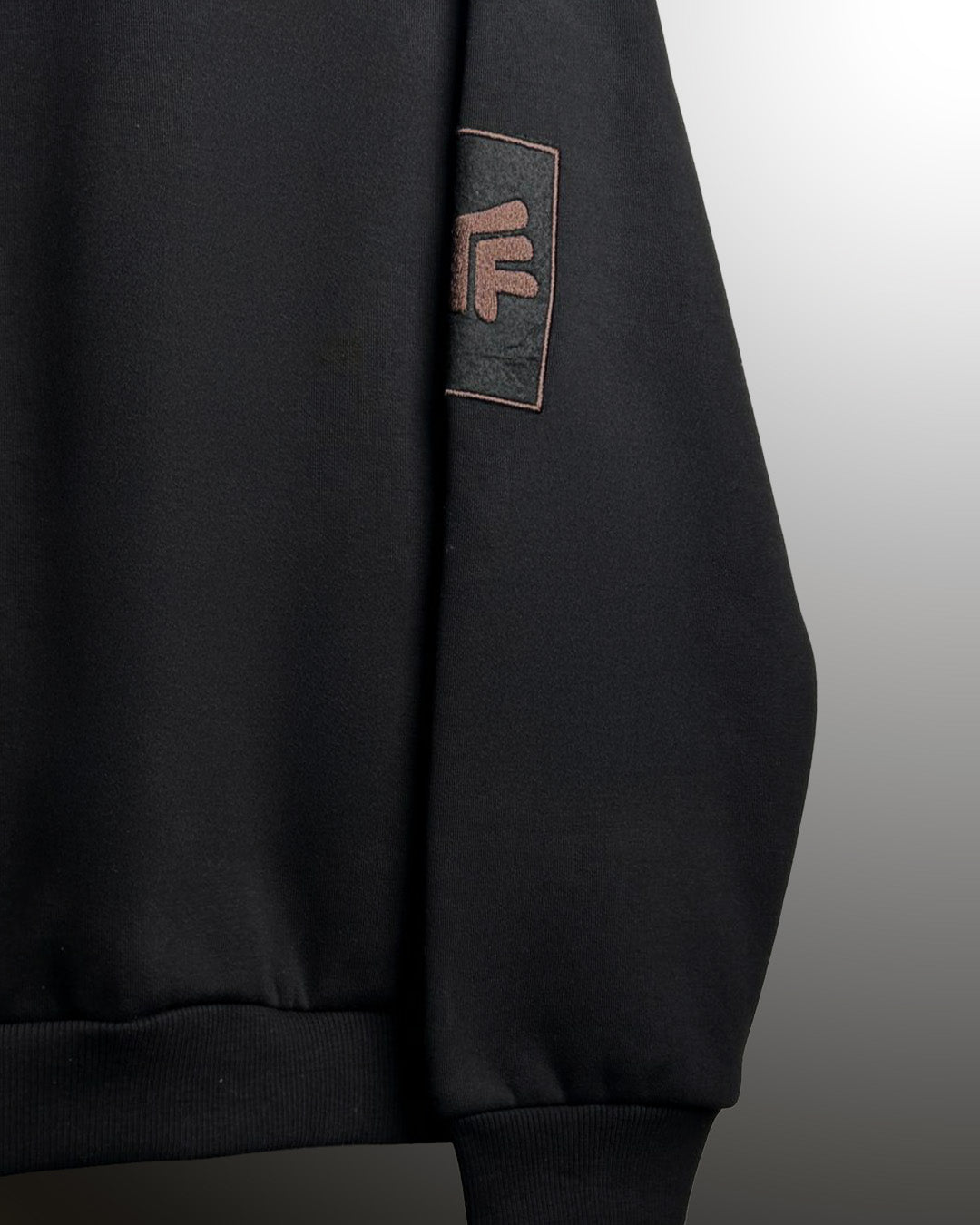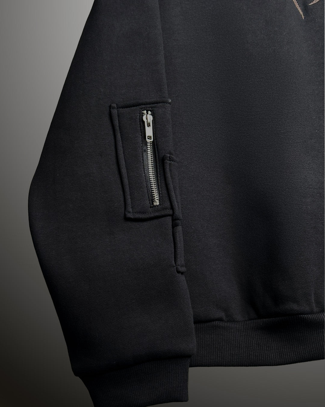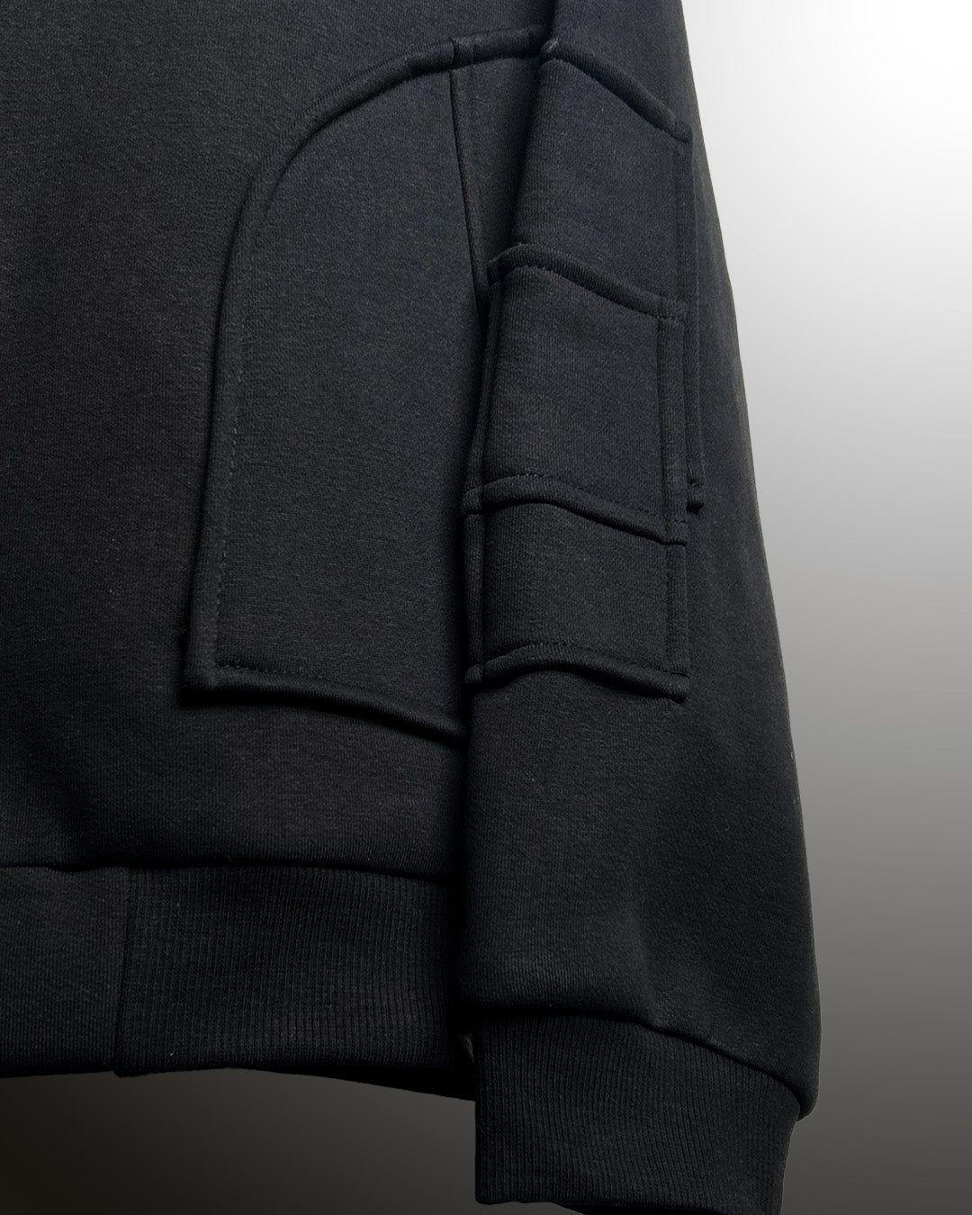 A black jacket defined by contrast and restraint. The leather-cut collar adds structure, while the cotton-fleece body softens the silhouette.