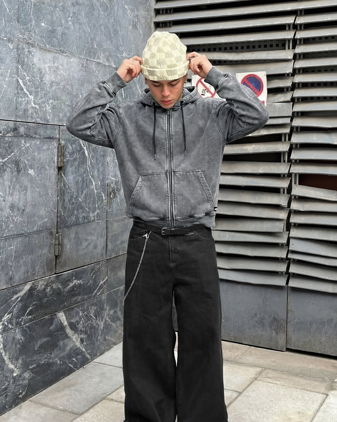 Washed smoke grey gives it that effortless, worn in edge. The structured boxy fit with dropped shoulders holds its shape, while the clean front zipper and kangaroo pockets keep it functional and sharp.